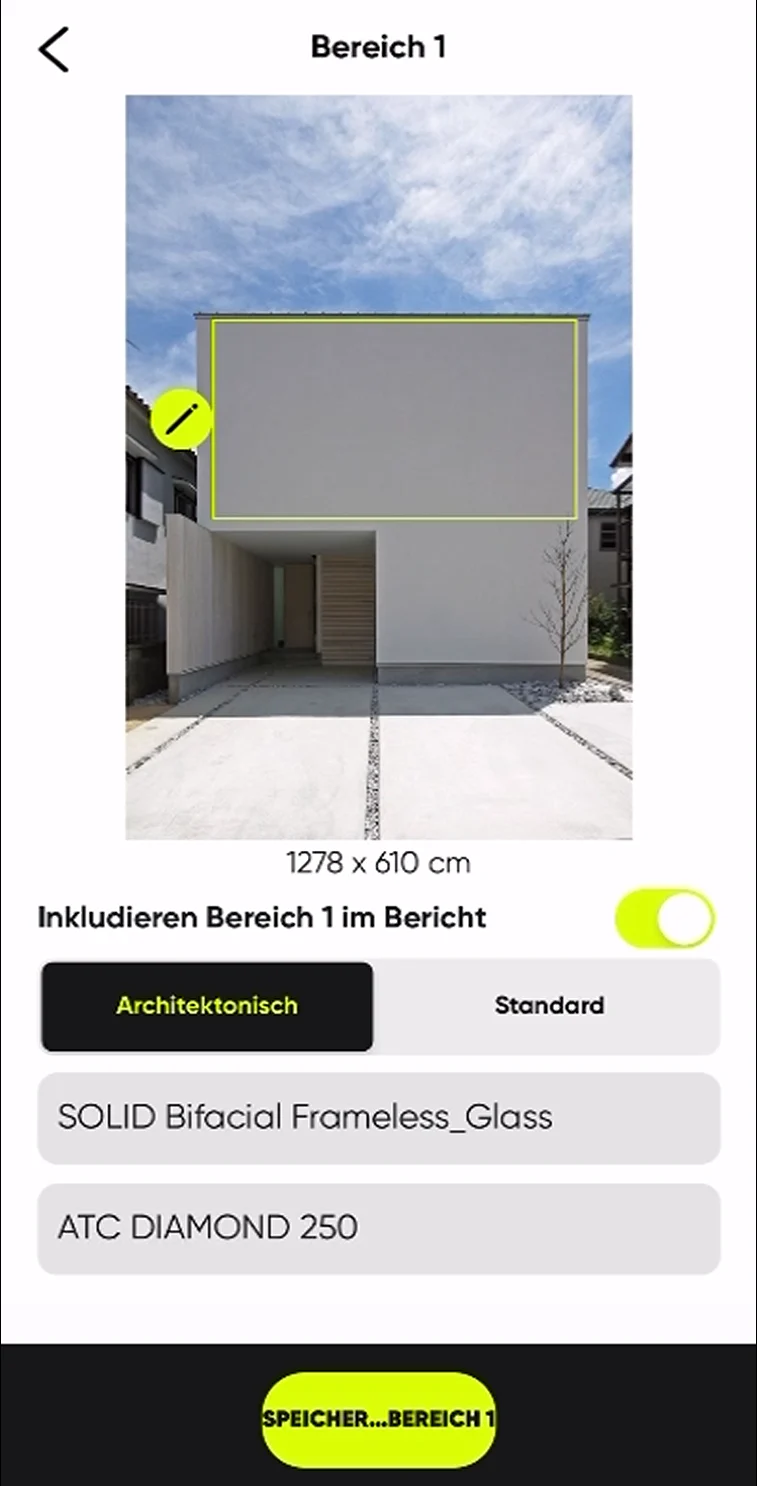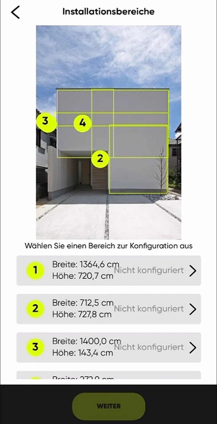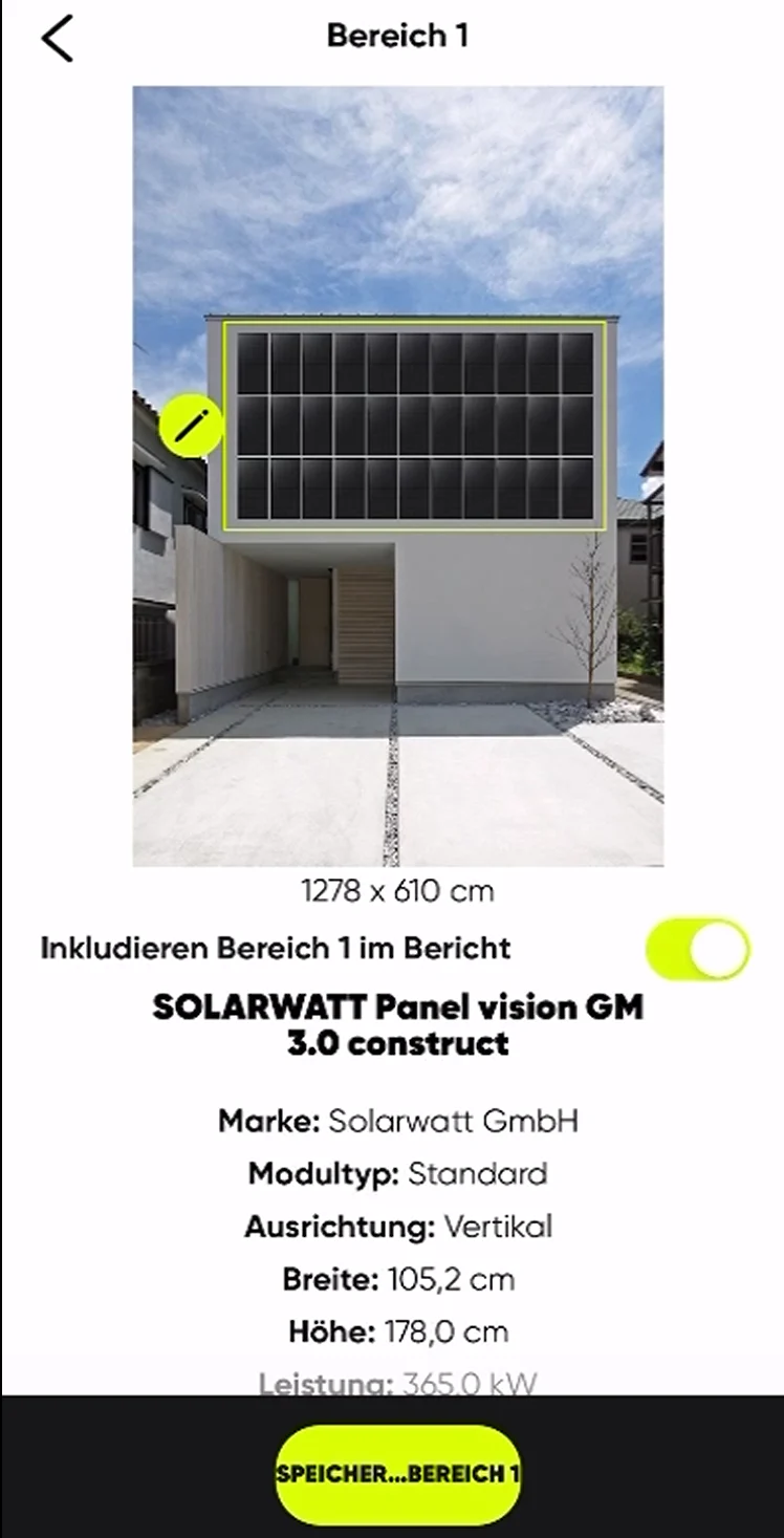 Wähle einen Installationsbereich, konfiguriere die PV-Fassade individuell und sieh sofort, wie die Module perfekt passen. Keine Unsicherheit – nur volle Klarheit.