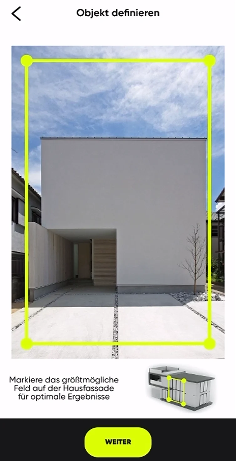 Die App analysiert die Fassade mit modernster KI, erkennt Objekte präzise und findet die besten Flächen für PV-Module und maximale Effizienz.